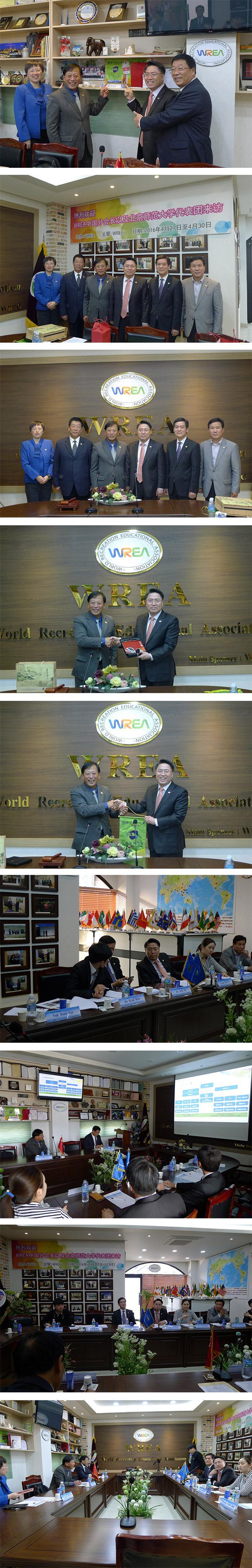 WREA 中国分会长协北京师范大学珠海分校代表团一行访问 11607 2016.05.03 11:23 4月27日至4月30日,中国分会长及北京师范大学珠海分校代表团一行范文WREA。 重点讨论教育项目、休闲产业座谈会、体育休闲大学经营方案、珠海市休闲旅游城市方案、12月即将举办的15周年国际学术大会等事宜。