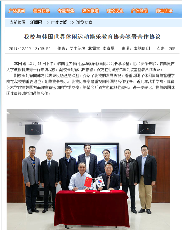 WREA会长访问广州体育学院,签署商业合作项目(2017.12) 10698 2018.01.04 16:06 WREA会长访问广州体育学院,签署商业合作项目 在欢迎词屏幕前 广州体育学院位于广州中心地段 广州体育学院学生们听取李荣基会长特讲